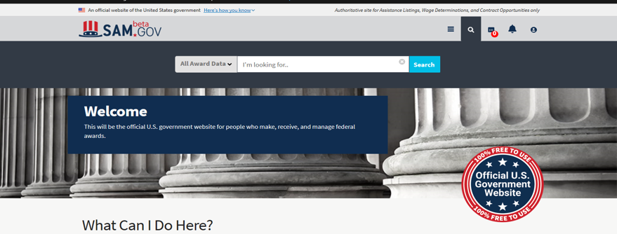 SAM.gov – System for Award Management. This is where a company registers to do business with government. Anyone who wants to be awarded a contract (acquisition award) or a grant (assistance award) from the federal government must be registered here.