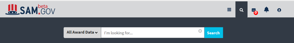 The search bar is available on almost every page in sam.gov, either near the top of the page by the header or in a sidebar. If you know a unique identifier for what you are looking for, you can enter that and choose the entity you would like to search.