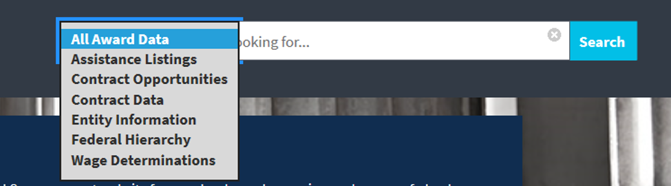 The magnifying glass allows you to search for information on the site using the categories of All Award Data, Assistance Listings, Contract Opportunities, Contract Data, Entity Information, Federal Hierarchy, and Wage Determinations. Basically, the content of the legacy systems broke down into their own categories.